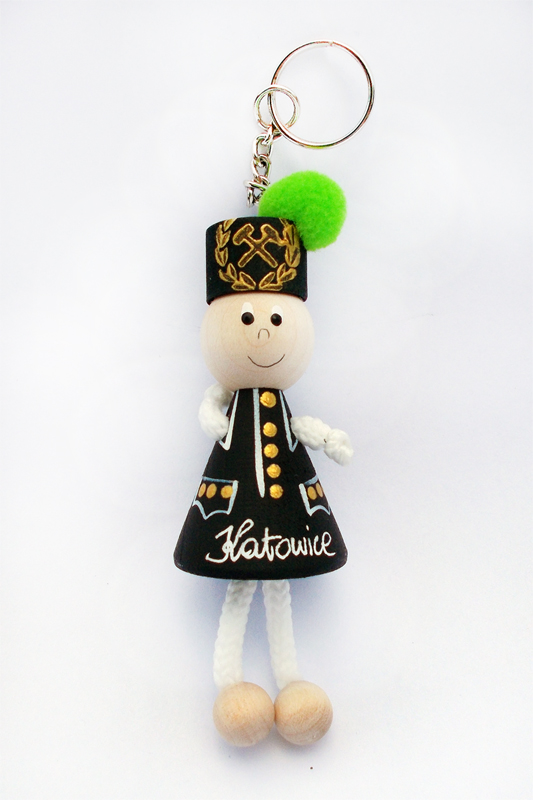 Brelok z drewnianą figurką górnika. Na figurce napis Katowice.