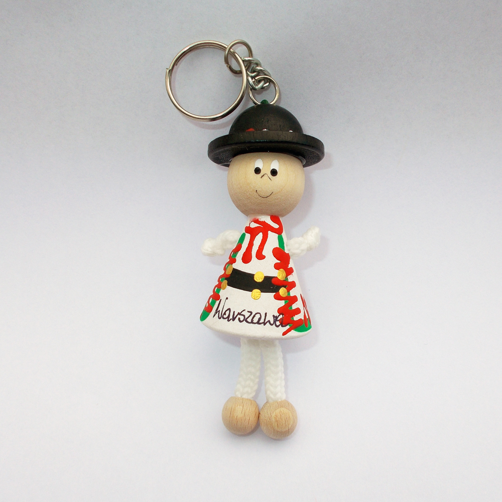 Brelok z drewnianą laleczką w stroju góralskim. Na laleczce napis Warszawa.