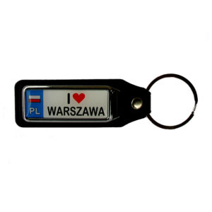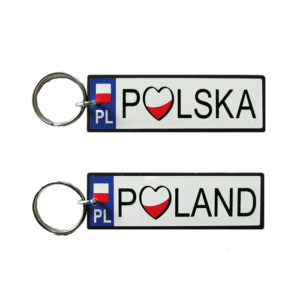 Brelok z drewnianą laleczką w namalowanym stroju ludowym. Na laleczce napis Polska.