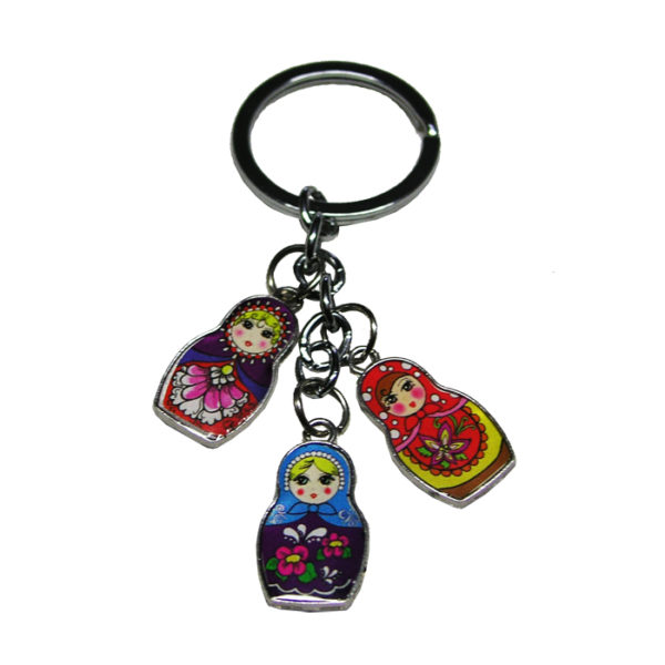 Brelok na którego łańcuszku zostały przyczepione trzy różne przywieszki w kształcie i z wizerunkiem matrioszki.