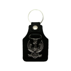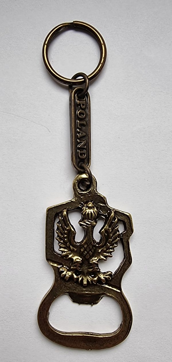 Metalowy brelok z otwieraczem. Ozdobiony figurką orła oraz napisem Polska.
