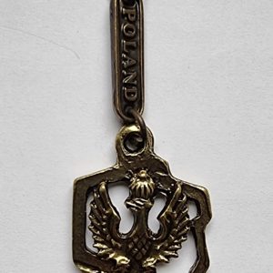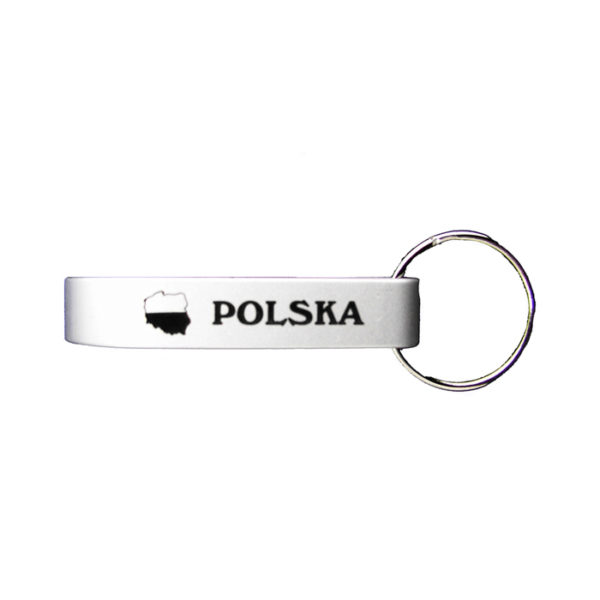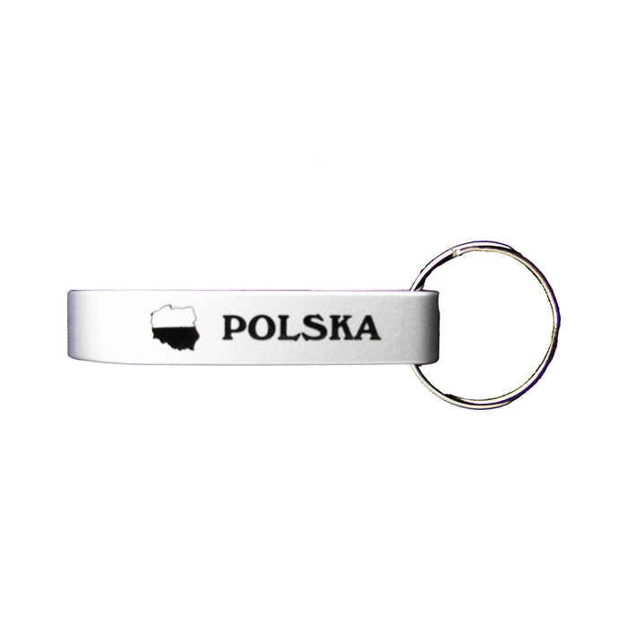 Brelok z otwieraczem z metalu, ozdobiony napisem Polska oraz konturem Polski.