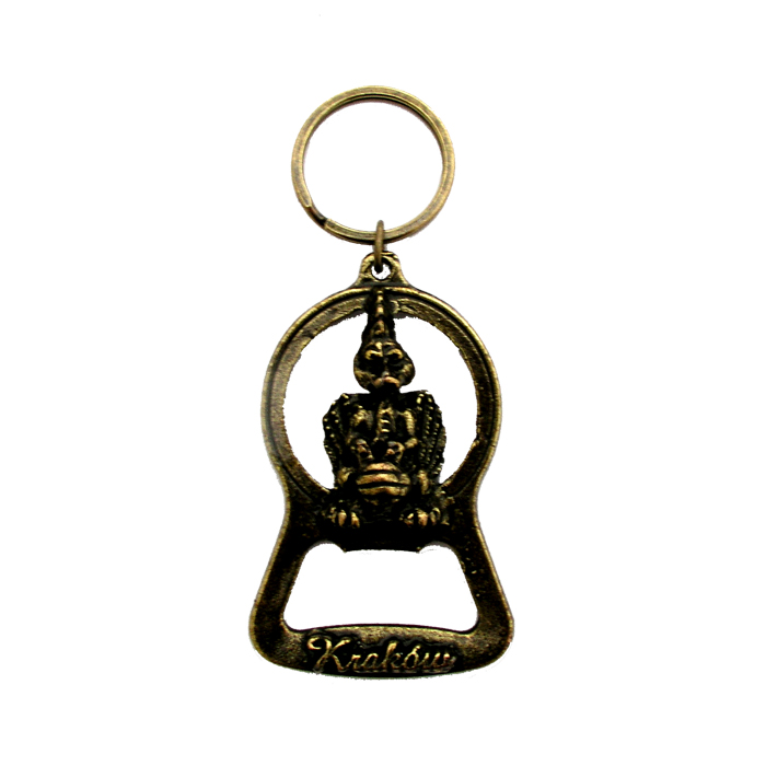 Metalowy brelok z otwieraczem. Ozdobiony figurką smoka oraz napisem Kraków.