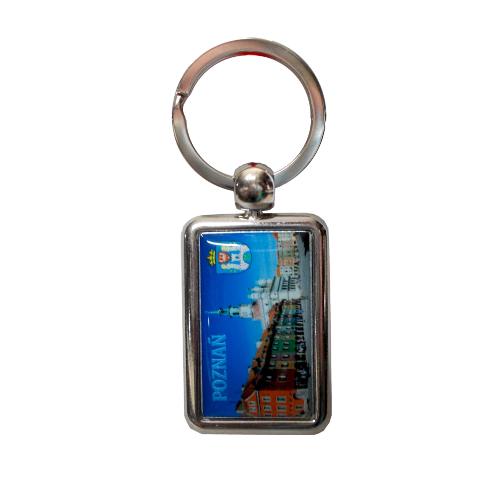 Brelok metalowy z wklejką przedstawiającą zdjęcie Domków Budniczych oraz Ratusza w Poznaniu.