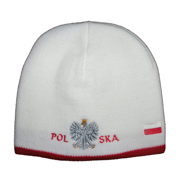 Biała czapka z dzianiny, z wyhaftowanym orłem dzielącym napis Polska.