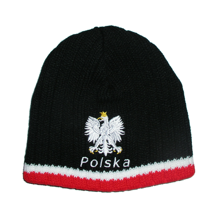 Czarna, zimowa czapka z akrylu, z wyhaftowanym orłem i napisem Polska.