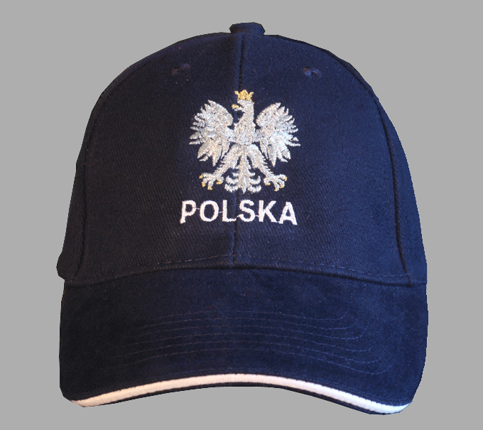Bawełniana czapka z daszkiem w kolorze granatowym. Od frontu wyhaftowany Orzeł a pod nim napis Polska. Z tyłu zapięcie metalowe z regulacją.