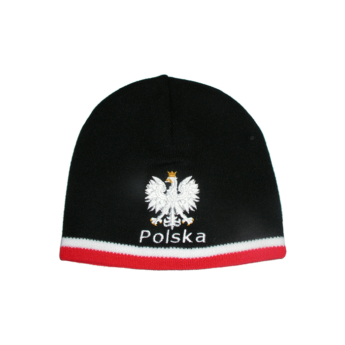 Czarna czapka z dzianiny, z wyhaftowanym orłem i napisem Polska.