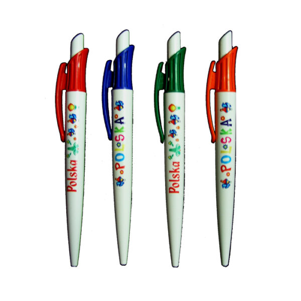 Plastikowy długopis z nadrukowanym wzorem folklorystycznym oraz napisem Polska.