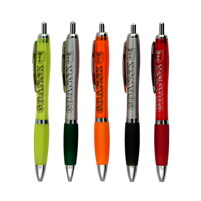 Różnokolorowe długopisy z wymiennym wkładem, ozdobione herbem Gdańska oraz napisem Gdańsk.
