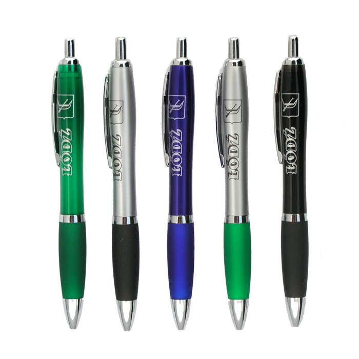 Różnokolorowe długopisy z wymiennym wkładem, ozdobione herbem Łodzi oraz napisem Łódź.