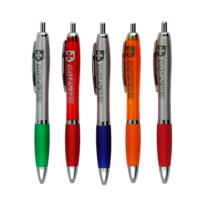 Różnokolorowe długopisy z wymiennym wkładem, ozdobione herbem Rzeszowa oraz napisem Rzeszów.