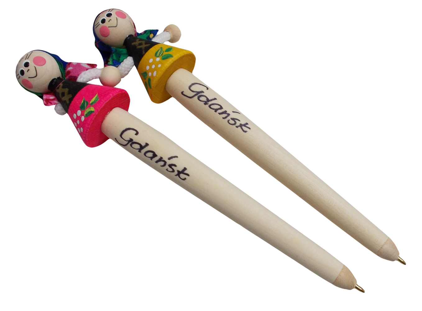 Drewniany długopis z lalką w stroju ludowym oraz napisem Gdańsk