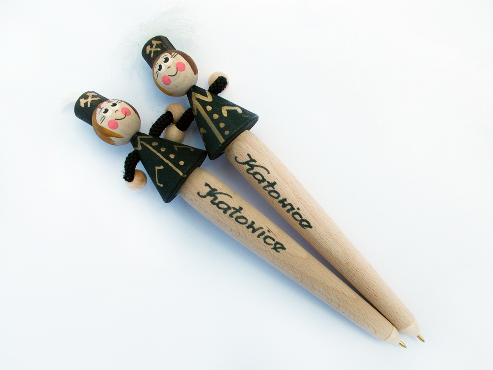 Drewniany długopis z lalką w stroju ludowym oraz napisem Katowice.