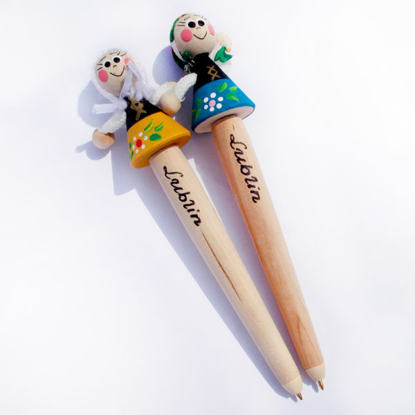 Drewniany długopis z lalką w stroju ludowym oraz napisem Lublin