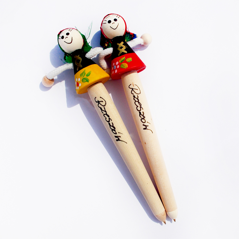 Drewniany długopis z lalką w stroju ludowym oraz napisem Rzeszów