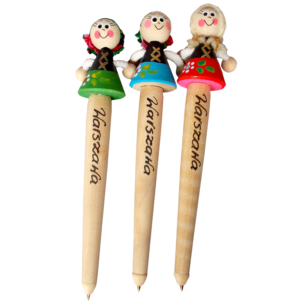 Drewniany długopis z lalką w stroju ludowym oraz napisem Warszawa