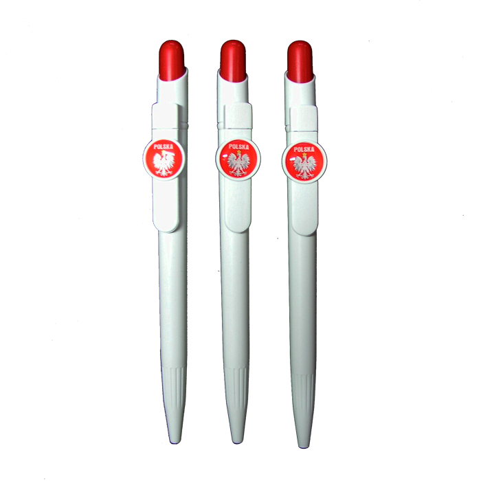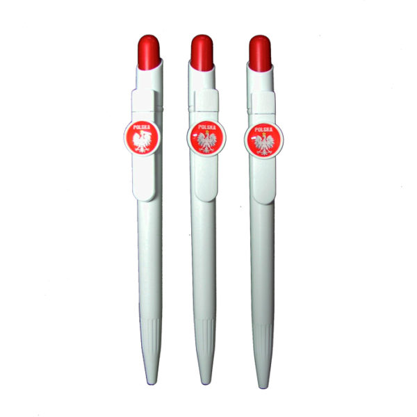 Biały długopis z wymiennym wkładem, ozdobiony wklejką z wizerunkiem orła.