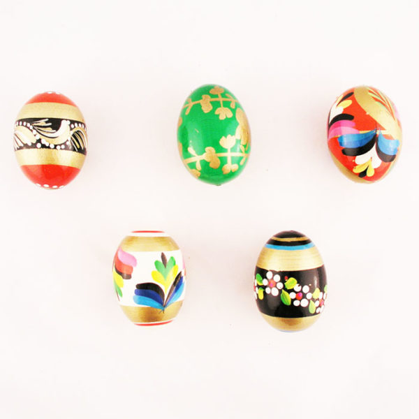 Drewniane, ręcznie malowane jajko. Do zdobienia wykorzystano złotą farbę. Ponieważ jajka są ręcznie malowane, posiadają różne wzory zdobień.
