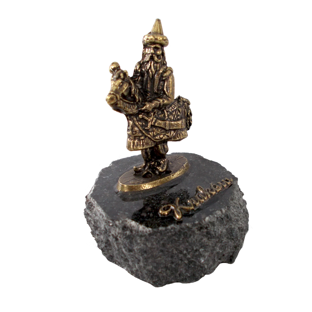 Metalowa figurka lajkonika na kamieniu o różnych kolorach z napisem Kraków.