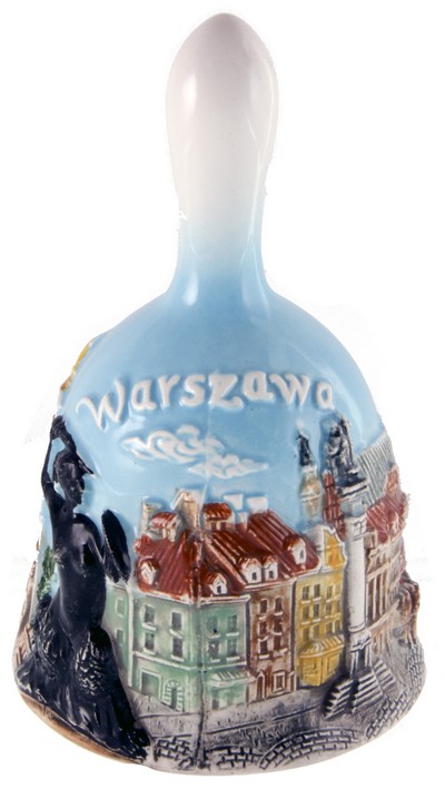 Dzwonek ceramiczny ręcznie malowany i szlifowany ozdobiony płaskorzeźbami przedstawiającymi krajobraz Warszawy.