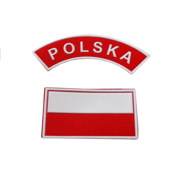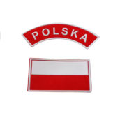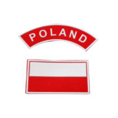 Emblemat (naszywka) dwuczęściowa przedstawiający flagę Polski wraz z napisem Polska lub Poland. Wykończenie z gumy.