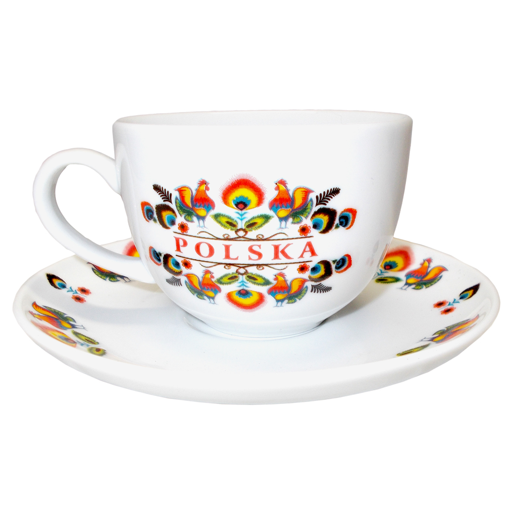 Filiżanka biała z talerzykiem. Wzór folklorystyczny z kogutami