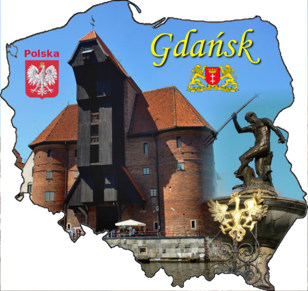 Fotomagnes w kształcie granic Polski. Prezentuje Żurawia Portowego i Fontannę Neptuna w Gdańsku