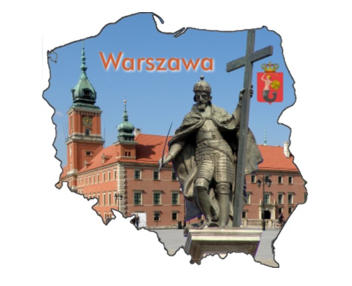 Fotomagnes w kształcie granic Polski. Prezentuje warszawską Starówkę oraz pomnik Syrenki.