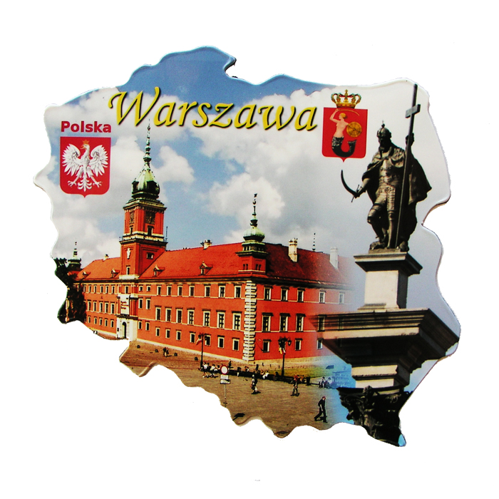 Fotomagnes w kształcie granic Polski. Prezentuje plac Zamkowy w Warszawie z Zamkiem Królewskim.