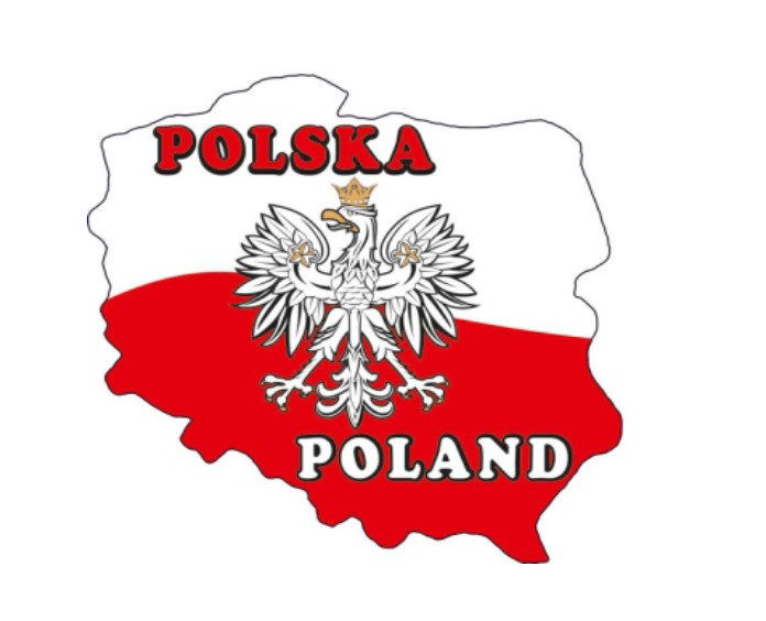 Fotomagnes w kształcie granic Polski. Prezentuje Orła na biało czerwonym tle.