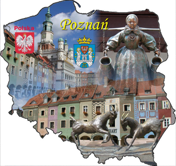 Fotomagnes w kształcie granic Polski. Prezentuje Poznański ratusz, koziołki i studzienkę Bamberki w Poznaniu.