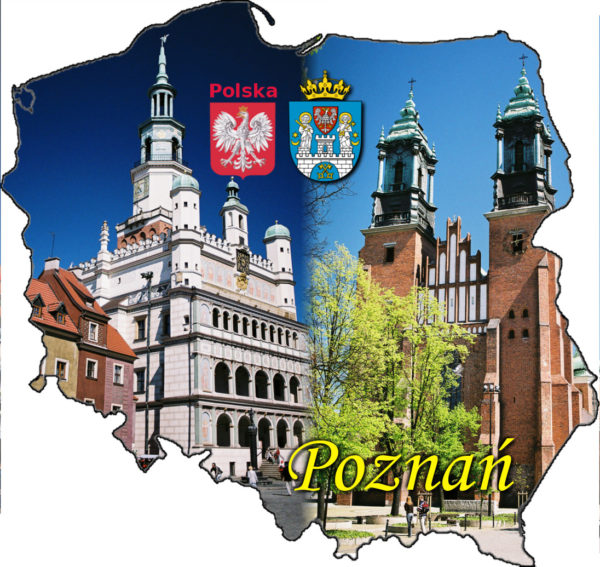 Fotomagnes w kształcie granic Polski. Prezentuje Poznański ratusz i bazylikę św. Piotra i Pawła w Poznaniu.