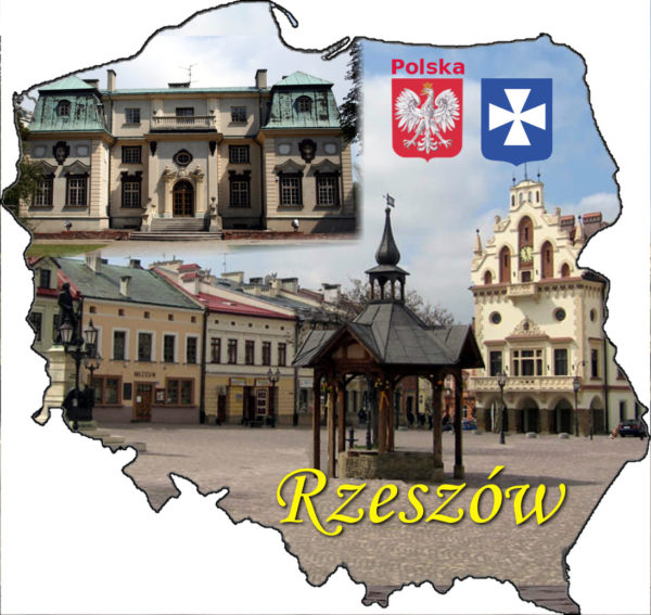 Fotomagnes w kształcie granic Polski. Prezentuje rynek w Rzeszowie ze studzienką i letni Pałac Lubomirskich.