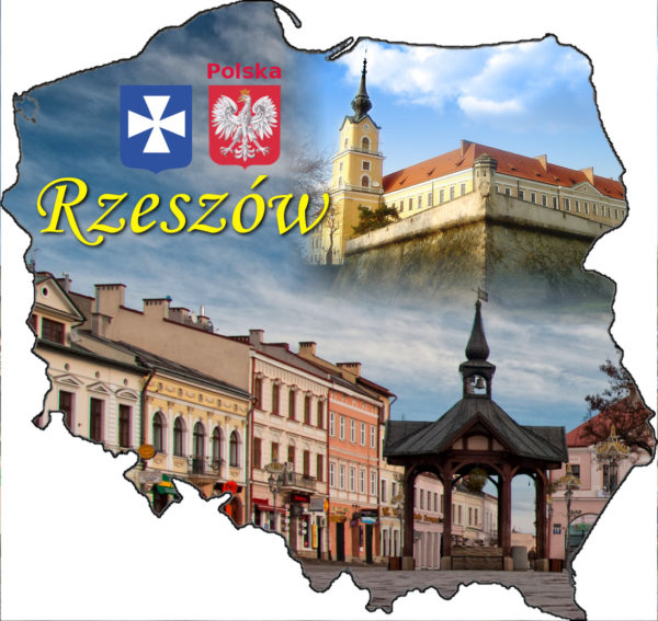 Fotomagnes w kształcie granic Polski. Prezentuje rynek w Rzeszowie ze studzienką i Zamek Lubomirskich.