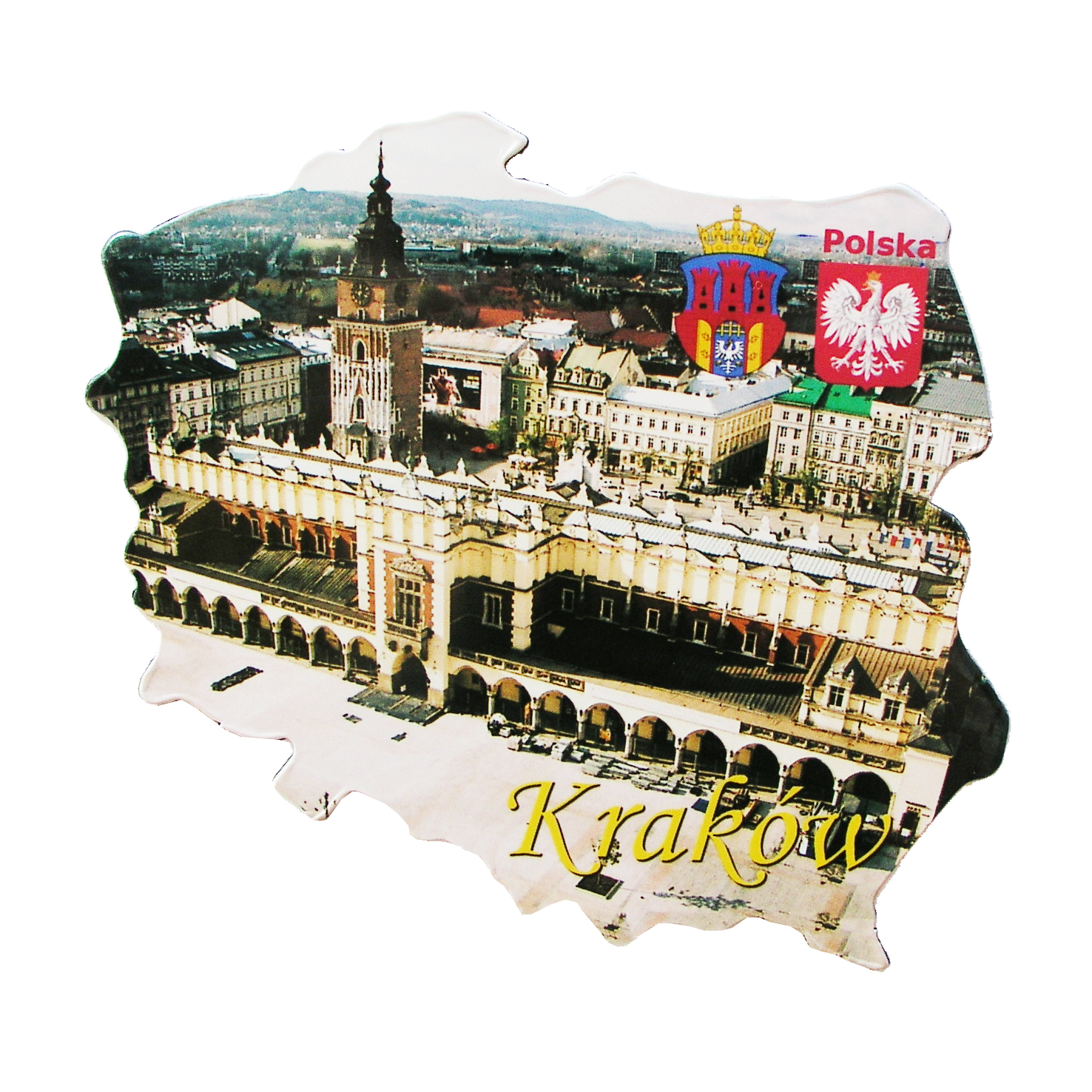 Fotomagnes w kształcie granic Polski. Prezentuje krakowskie Sukiennice.