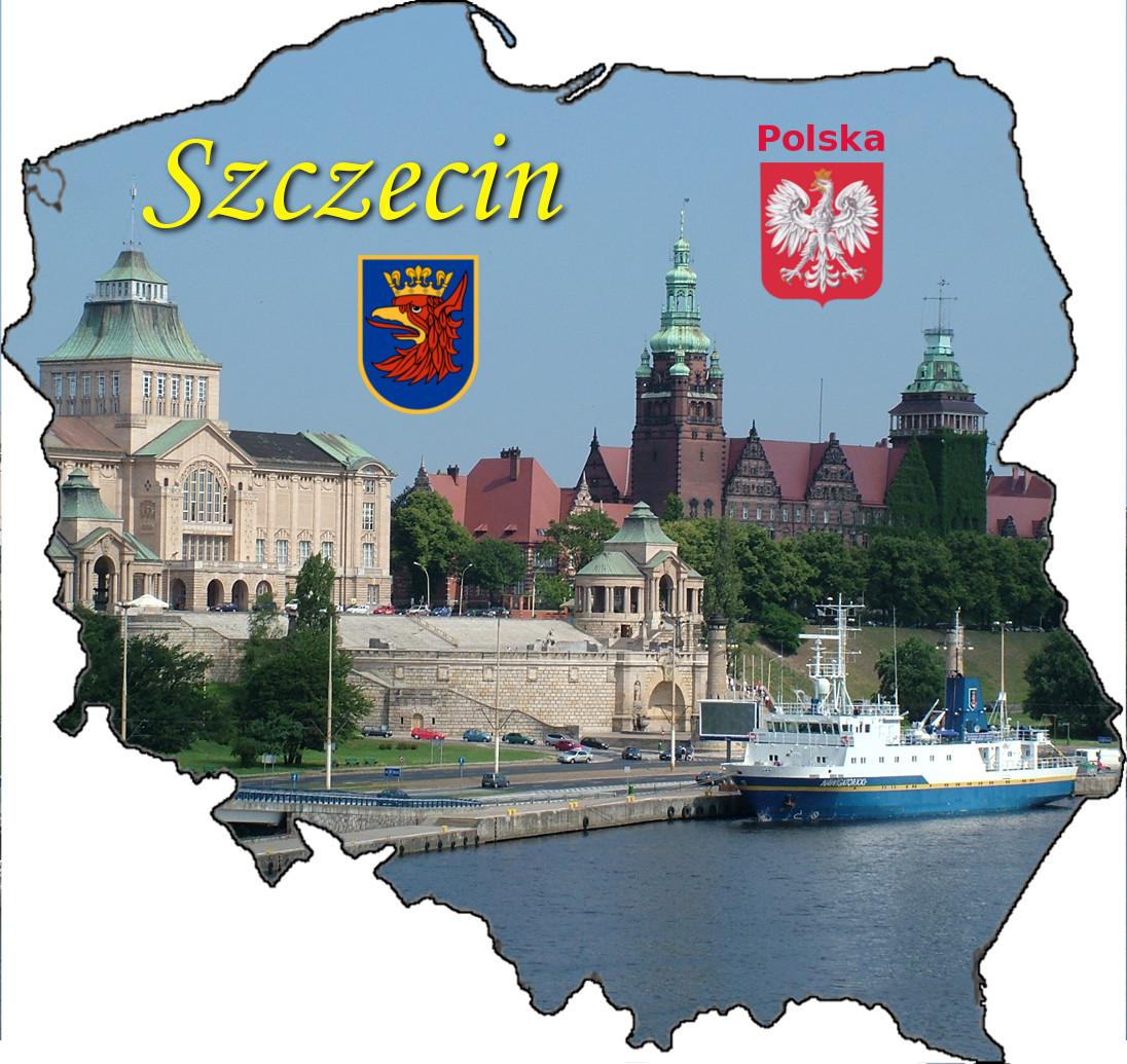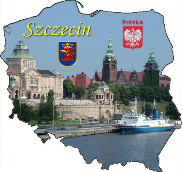 Fotomagnes w kształcie granic Polski. Prezentuje Wały Chrobrego w Szczecinie na których znajdują się Urząd Wojewódzki i Muzeum Narodowe w Szczecinie.