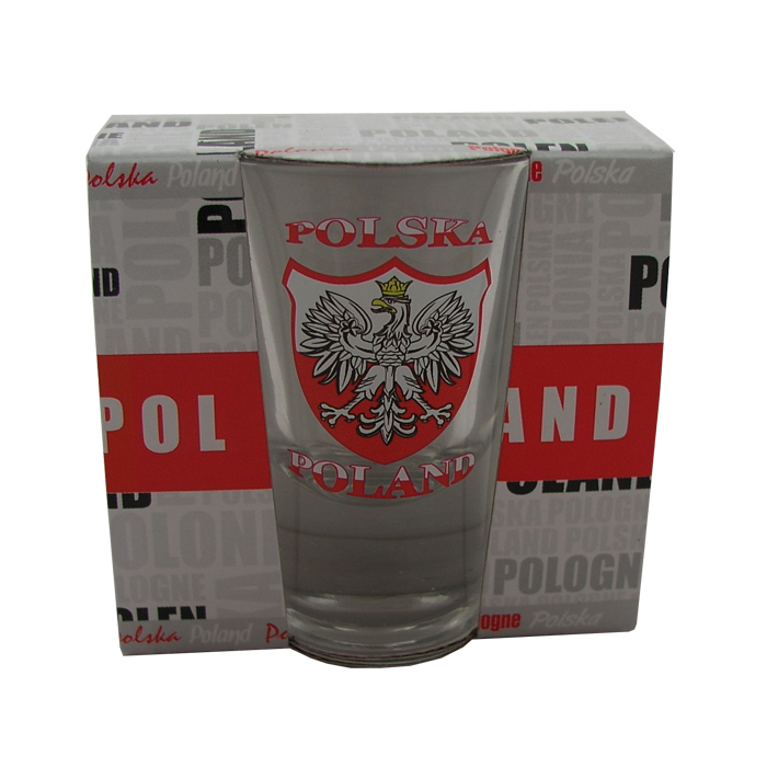 Pojedynczy kieliszek w tekturowym opakowaniu. Nadruk przedstawia godło Polski i napisy Polska, Poland