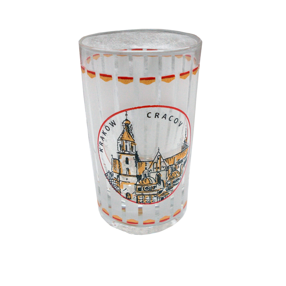 Szklany, paskowany kieliszek ozdobiony grafika katedry Wawelskiej oraz napisami Kraków, Cracow.