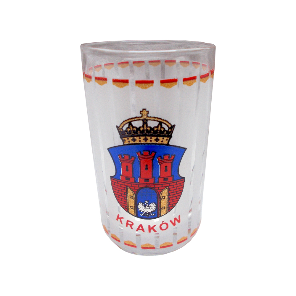 Szklany, paskowany kieliszek ozdobiony herbem Krakowa oraz napisem Kraków.