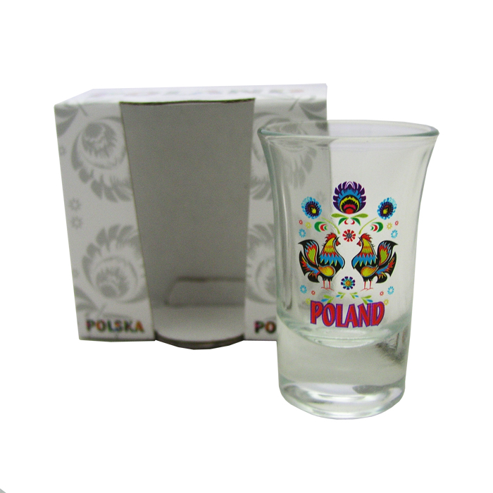 Pojedynczy kieliszek w tekturowym opakowaniu. Ozdobiony folklorystycznym nadrukiem z kogutami.
