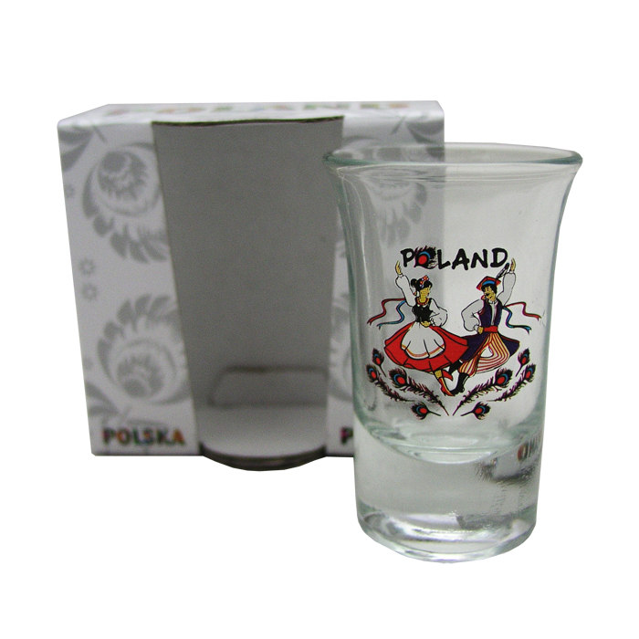 Pojedynczy kieliszek w tekturowym opakowaniu. Ozdobiony folklorystycznym nadrukiem z krakowiakami.