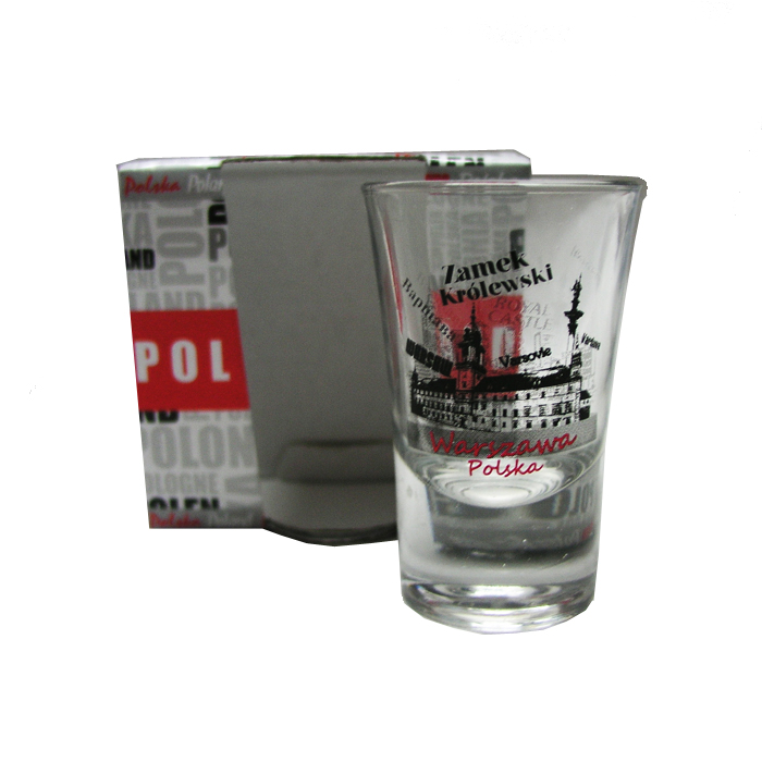 Pojedynczy kieliszek w tekturowym opakowaniu. Nadruk przedstawia Zamek Królewski w Warszawie.