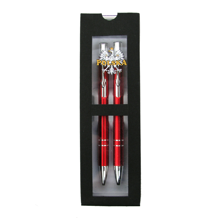 Komplet długopis i ołówek w eleganckim etui z nadrukowanym orłem w tarczy. Długopis i ołówek także opatrzone nadrukiem z orłem i napisem Polska.
