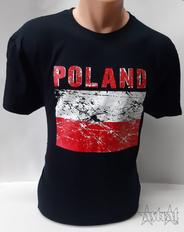 Koszulka w kolorze czarnym z nadrukiem przedstawiającym flagę Polski. Wykonana z wysokiej jakości bawełny. Materiał dopasowuje się do ciała, nie rozchodzi w praniu, dobrze się prasuje. Podwójny szew wokół szyi, przy rękawach oraz u dołu koszulki. Bez szwów bocznych. Taśma wzmacniająca wzdłuż karku.