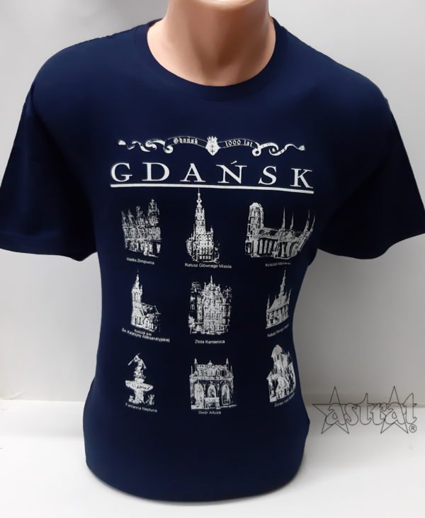 Koszulka w kolorze granatowym z nadrukiem prezentującym zabytki Gdańska.