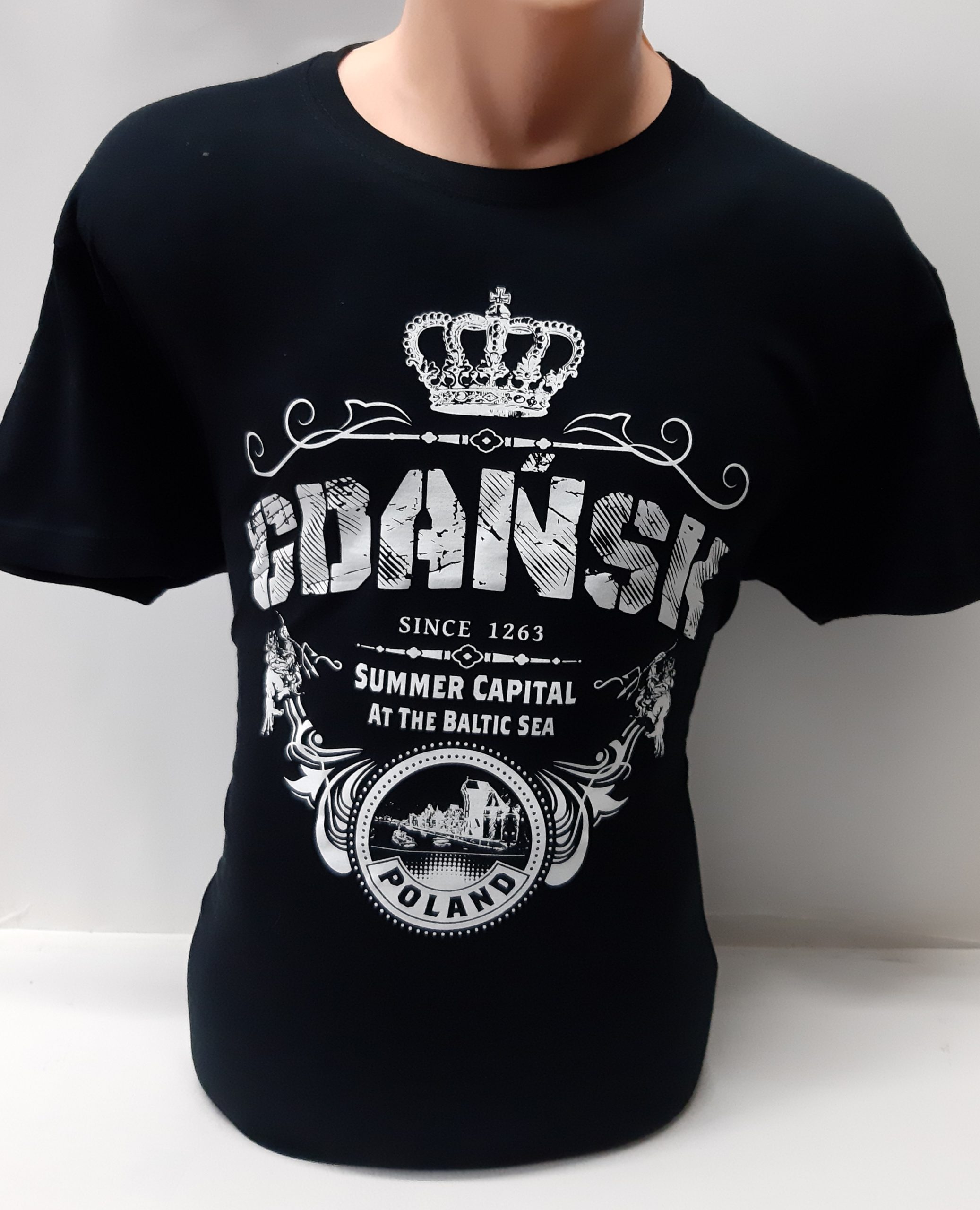 Koszulka w kolorze czarnym z nadrukiem przedstawiającym napis MGM Gdańsk. Wykonana z wysokiej jakości bawełny. Materiał dopasowuje się do ciała, nie rozchodzi w praniu, dobrze się prasuje. Podwójny szew wokół szyi, przy rękawach oraz u dołu koszulki. Bez szwów bocznych. Taśma wzmacniająca wzdłuż karku.