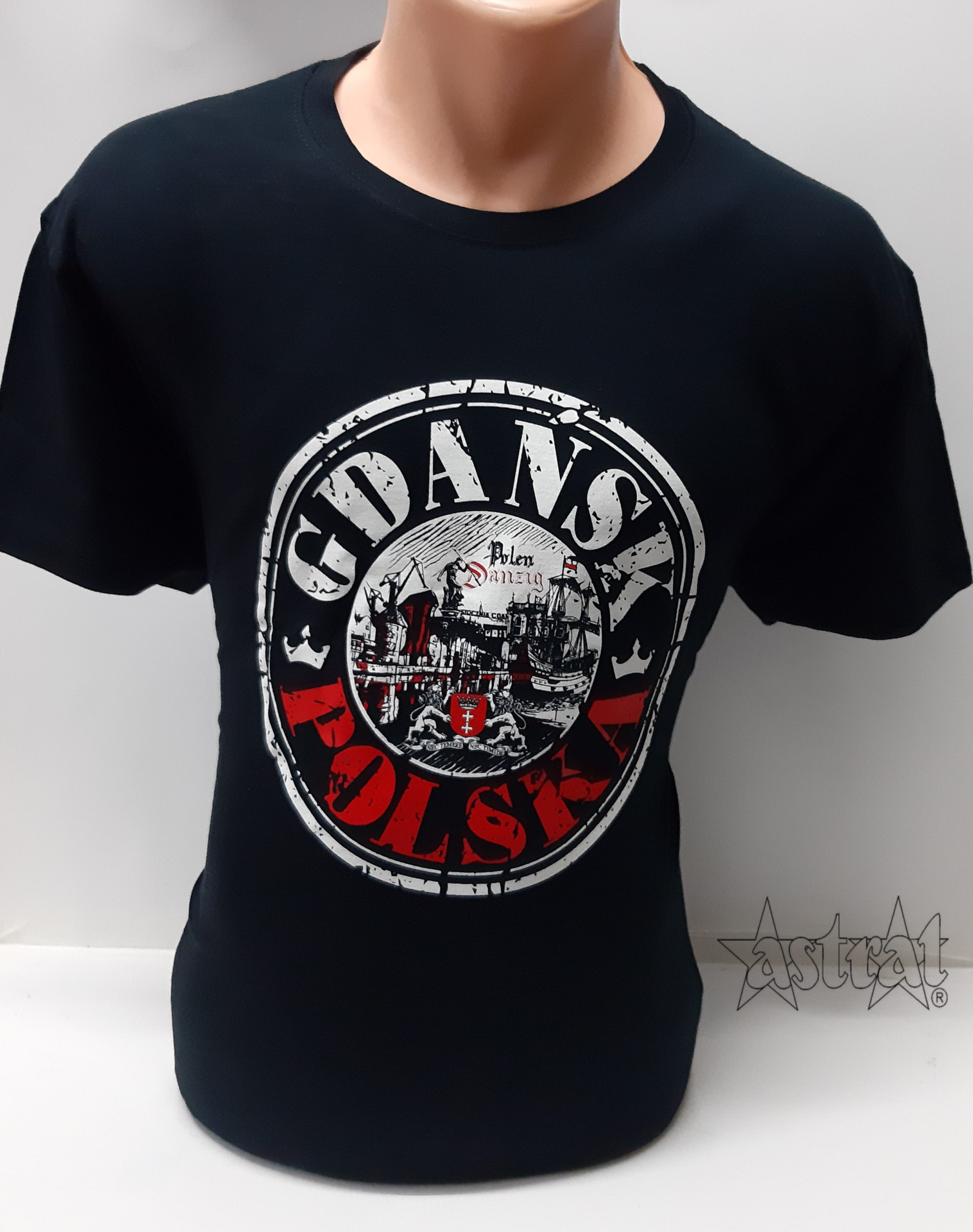 Koszulka w kolorze czarnym z nadrukiem okrągłym na środku. Wykonana z wysokiej jakości bawełny. Materiał dopasowuje się do ciała, nie rozchodzi w praniu, dobrze się prasuje. Podwójny szew wokół szyi, przy rękawach oraz u dołu koszulki. Bez szwów bocznych. Taśma wzmacniająca wzdłuż karku.