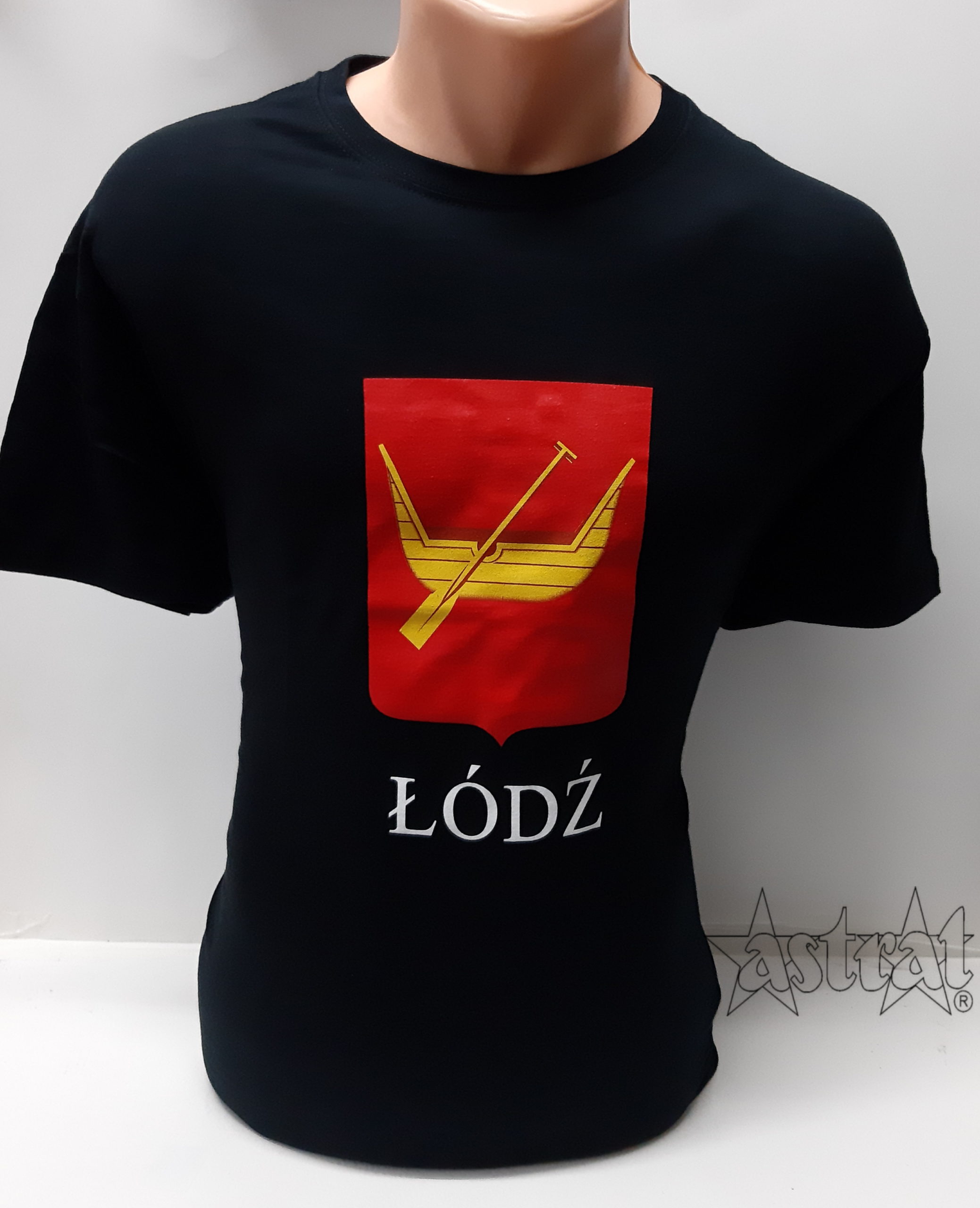 Koszulka w kolorze czarnym z nadrukiem herbu Łodzi. Wykonana z wysokiej jakości bawełny. Materiał dopasowuje się do ciała, nie rozchodzi w praniu, dobrze się prasuje. Podwójny szew wokół szyi, przy rękawach oraz u dołu koszulki. Bez szwów bocznych. Taśma wzmacniająca wzdłuż karku.