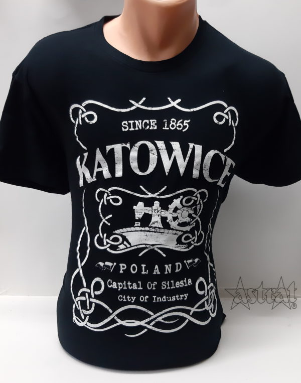 Koszulka w kolorze czarnym z nadrukiem ramki Katowic. Wykonana z wysokiej jakości bawełny. Materiał dopasowuje się do ciała, nie rozchodzi w praniu, dobrze się prasuje. Podwójny szew wokół szyi, przy rękawach oraz u dołu koszulki. Bez szwów bocznych. Taśma wzmacniająca wzdłuż karku.